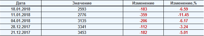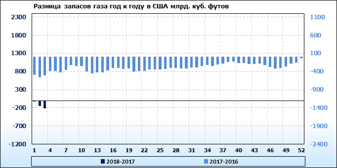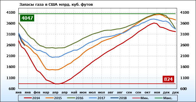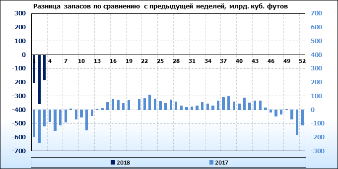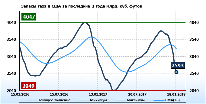 По сообщению статистической службы EIA запасы газа в США на 18.01.2018 составили 2593 млрд. куб. футов. За неделю запасы природного газа в хранилищах упали на 183 млрд. куб. футов. По итогам недели падение запасов газа составило -6.59 процентов.