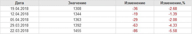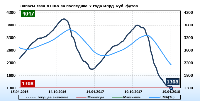 По сообщению статистической службы EIA запасы газа в США на 19.04.2018 составили 1308 млрд. куб. футов.