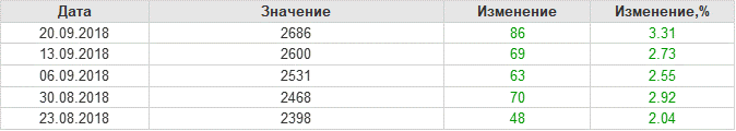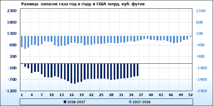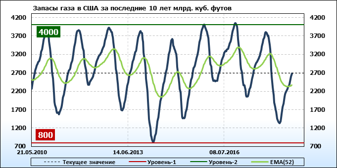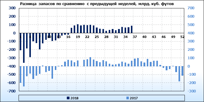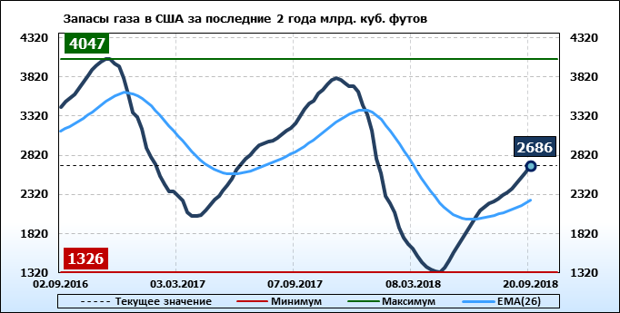 По сообщению статистической службы EIA, запасы газа в США на 20.09.2018 составили 2686 млрд. куб. футов. За неделю запасы природного газа в хранилищах выросли на 86 млрд. куб. футов. По итогам недели рост запасов газа составил 3.31 процента.