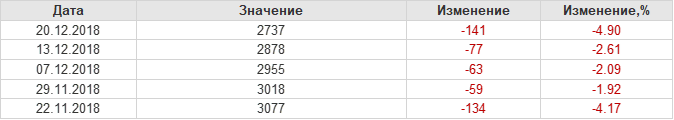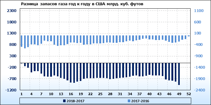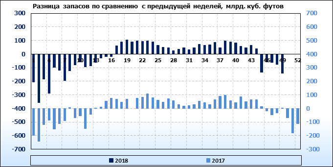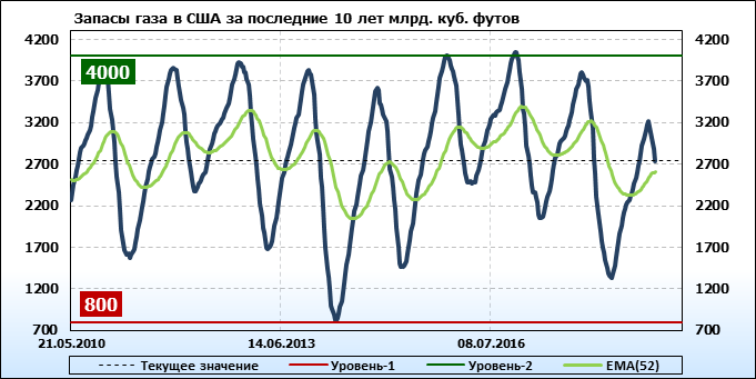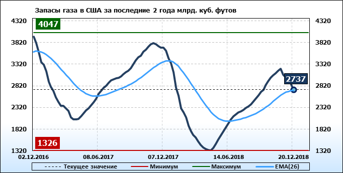 По сообщению статистической службы EIA запасы газа в США на 20.12.2018 составили 2737 млрд. куб. футов. За неделю запасы природного газа в хранилищах упали на -141 млрд. куб. футов. По итогам недели падение запасов газа составило -4.9 процента.