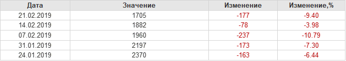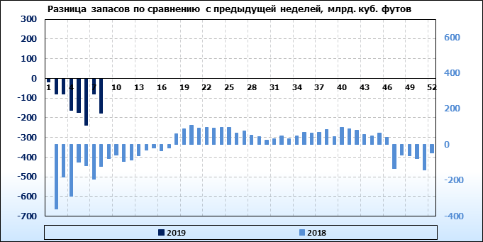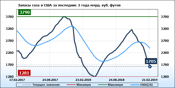 По сообщению статистической службы EIA от 21.02.2019 запасы газа в США на 14.02.2019 составили 1705 млрд. куб. футов. За неделю запасы природного газа в хранилищах упали на 177 млрд. куб. футов. По итогам недели падение запасов газа составило 9.4 процентов.