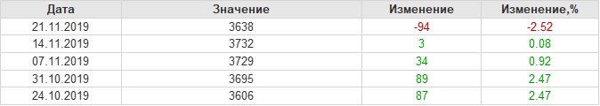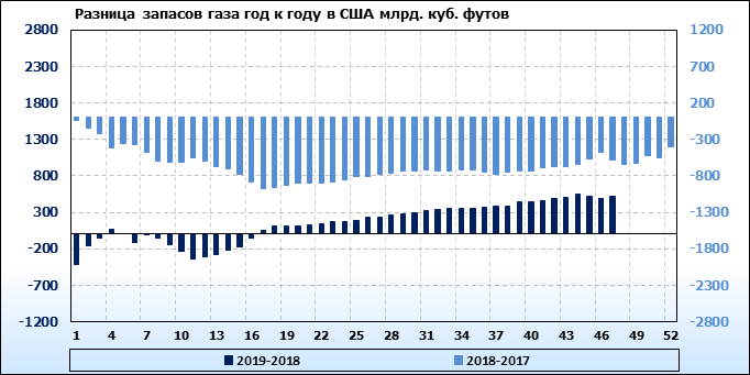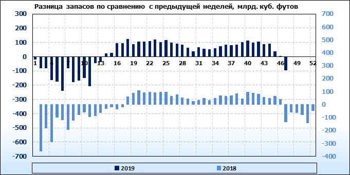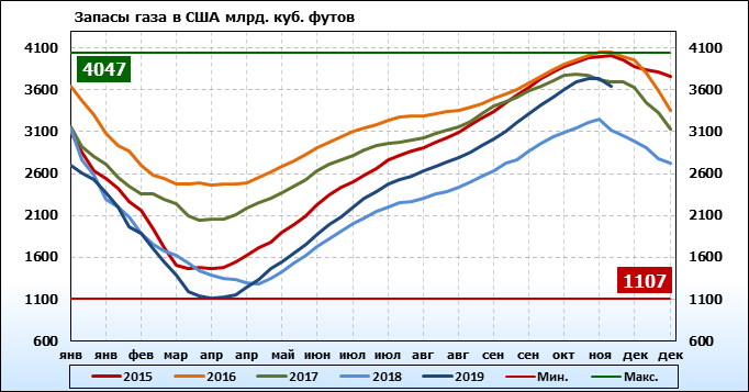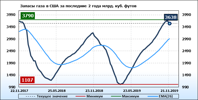 По сообщению статистической службы EIA от 21.11.2019 запасы газа в США на 14.11.2019 составили 3638 млрд. куб. футов. За неделю запасы природного газа в хранилищах упали на 94 млрд. куб. футов. По итогам недели падение запасов газа составило 2.52 процента.