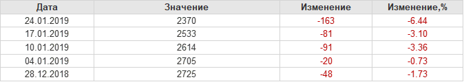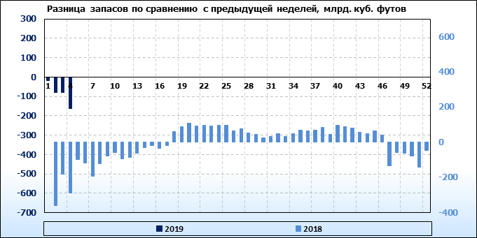 По сообщению статистической службы EIA от 24.01.2019 запасы газа в США на 17.01.2019 составили 2370 млрд. куб. футов. За неделю запасы природного газа в хранилищах упали на -163 млрд. куб. футов. По итогам недели падение запасов газа составило -6.44 процентов.