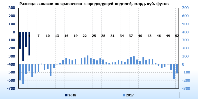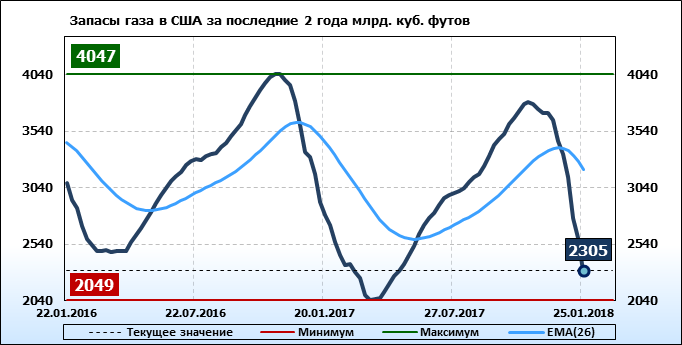 По сообщению статистической службы EIA запасы газа в США на 25.01.2018 составили 2 305 млрд. куб. футов. За неделю запасы природного газа в хранилищах упали на 288 млрд. куб. футов. По итогам недели падение запасов газа составило 11.11 процентов.