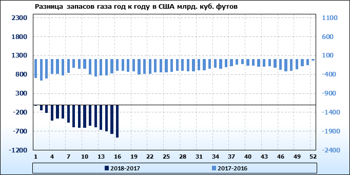 За неделю запасы природного газа в хранилищах упали на -18 млрд. куб. футов.
