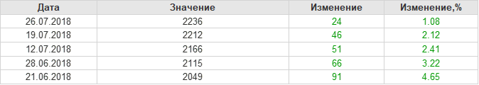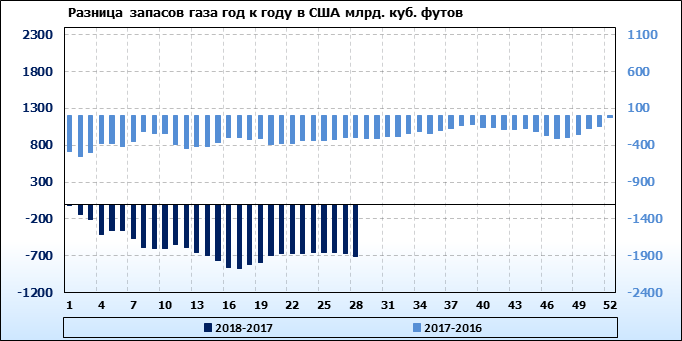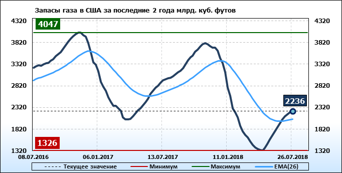 По сообщению статистической службы EIA запасы газа в США на 26.07.2018 составили 2236 млрд. куб. футов. За неделю запасы природного газа в хранилищах выросли на 24 млрд. куб. футов. По итогам недели рост запасов газа составил 1.08 процента.