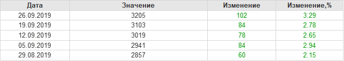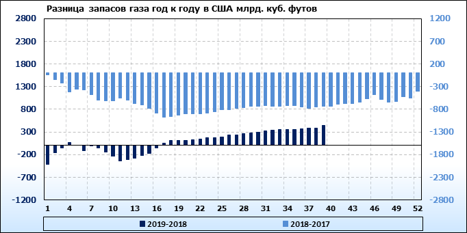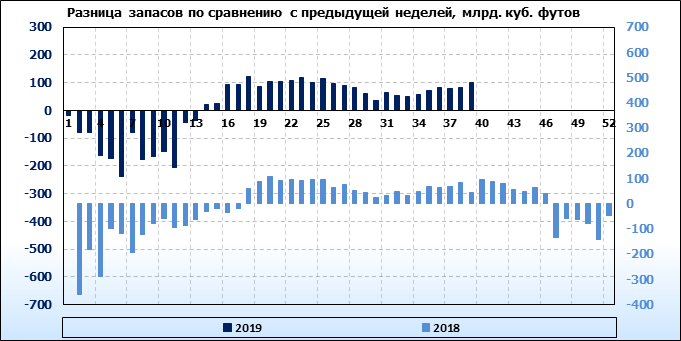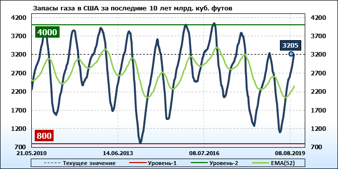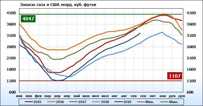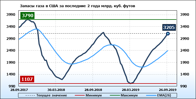 По сообщению статистической службы EIA от 26.09.2019 запасы газа в США на 19.09.2019 составили 3205 млрд. куб. футов. За неделю запасы природного газа в хранилищах выросли на 102 млрд. куб. футов. По итогам недели рост запасов газа составил 3.29 процента.