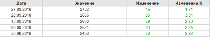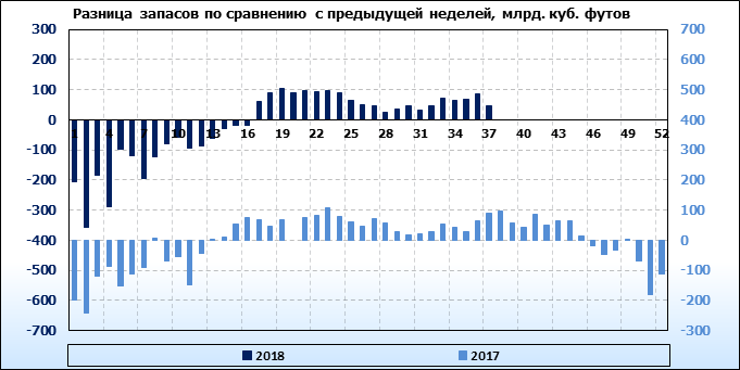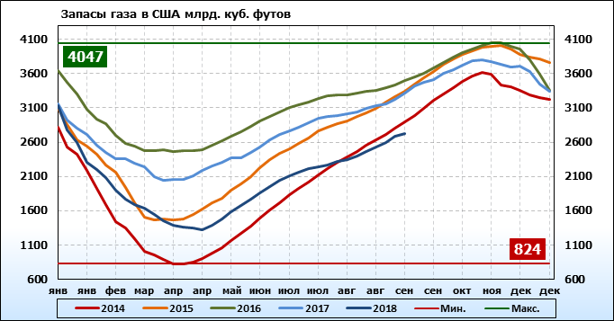 По сообщению статистической службы EIA запасы газа в США на 27.09.2018 составили 2732 млрд. куб. футов. За неделю запасы природного газа в хранилищах выросли на 46 млрд. куб. футов. По итогам недели рост запасов газа составил 1.71 процента.