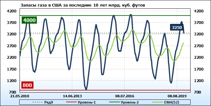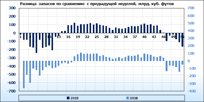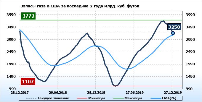По сообщению статистической службы EIA от 27.12.2019 запасы газа в США на 20.12.2019 составили 3250 млрд. куб. футов. За неделю запасы природного газа в хранилищах упали на 161 млрд. куб. футов. По итогам недели падение запасов газа составило 4.72 процента.