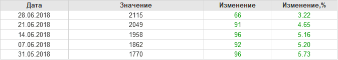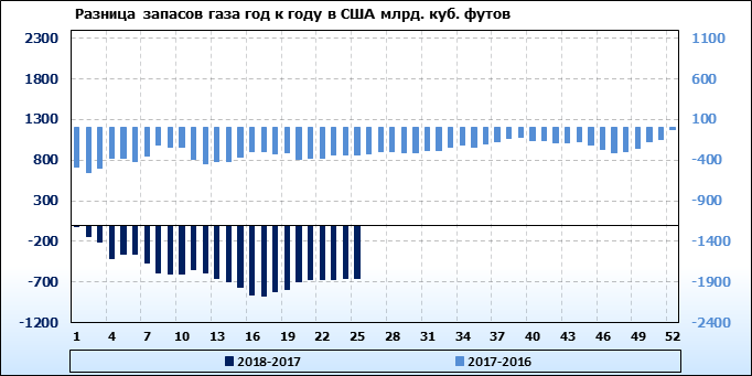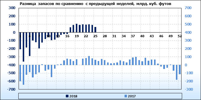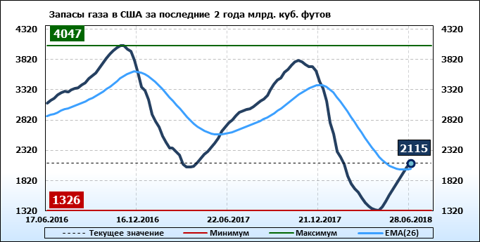 По сообщению статистической службы EIA запасы газа в США на 28.06.2018 составили 2115 млрд. куб. футов. За неделю запасы природного газа в хранилищах выросли на 66 млрд. куб. футов. По итогам недели рост запасов газа составил 3.22 процента.
