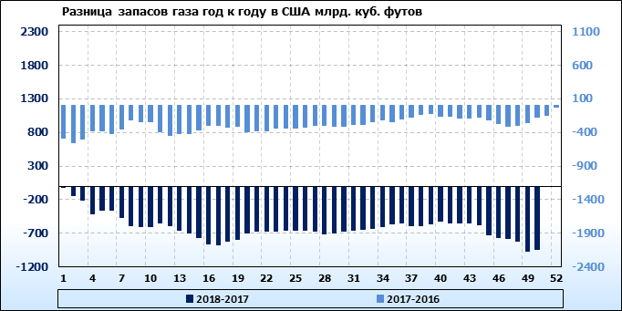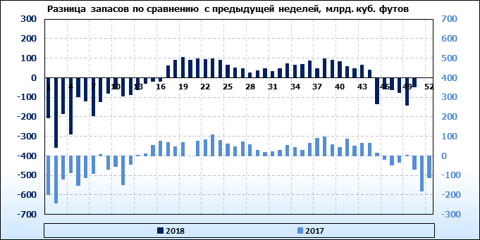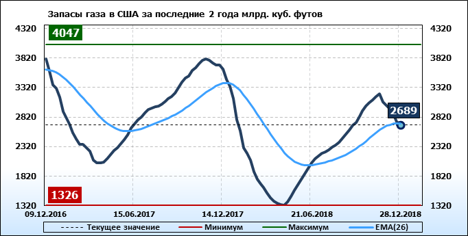По сообщению статистической службы EIA запасы газа в США на 28.12.2018 составили 2689 млрд. куб. футов. За неделю запасы природного газа в хранилищах упали на -48 млрд. куб. футов. По итогам недели падение запасов газа составило -1.75 процента.