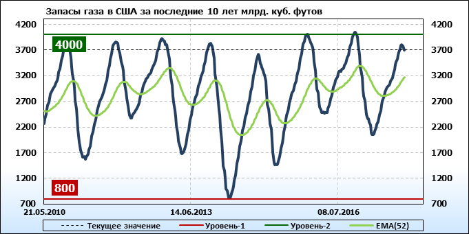 По сообщению статистической службы EIA запасы газа в США на 30.11.2017 составили 3 702 млрд. куб. футов. За неделю запасы природного газа в хранилищах упали на 33 млрд. куб. футов. По итогам недели падение запасов газа составило -0.88 процента.