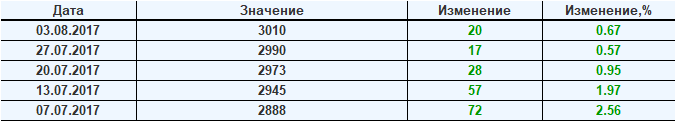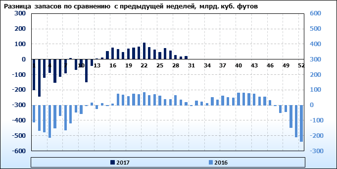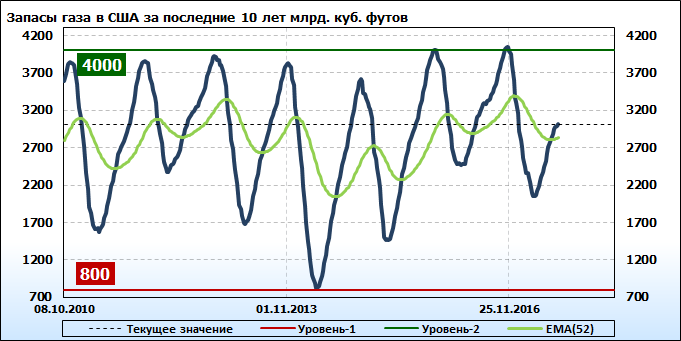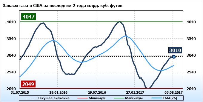 По сообщению статистической службы EIA запасы газа в США на 03.08.2017 составили 3010 млрд. куб. футов. За неделю запасы природного газа в хранилищах выросли на 20 млрд. куб. футов. По итогам недели рост запасов газа составил 0.67 процента.
