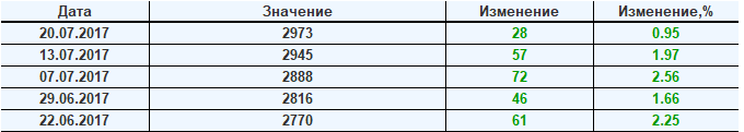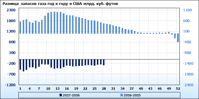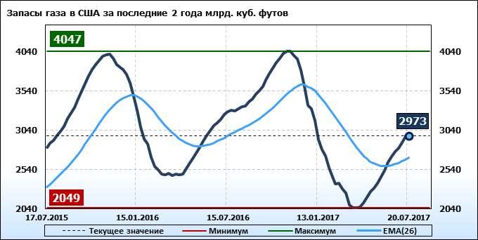 По сообщению статистической службы EIA запасы газа в США на 20.07.2017 составили 2945 млрд. куб. футов. За неделю запасы природного газа в хранилищах выросли на 28 млрд. куб. футов. По итогам недели рост запасов газа составил 0.95 процента.