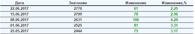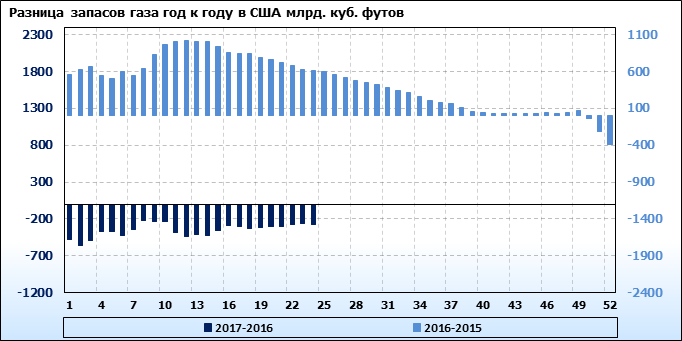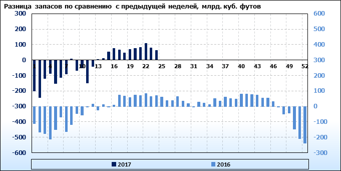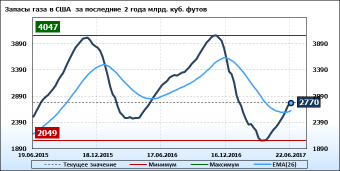 По сообщению статистической службы EIA запасы газа в США на 22.06.2017 составили 2770 млрд. куб. футов. За неделю запасы природного газа в хранилищах выросли на 61 млрд. куб. футов. По итогам недели рост запасов газа очевиден.