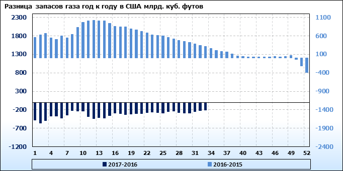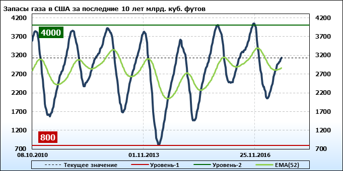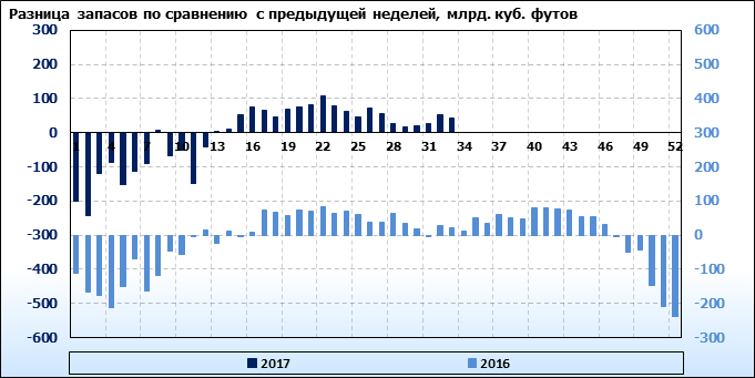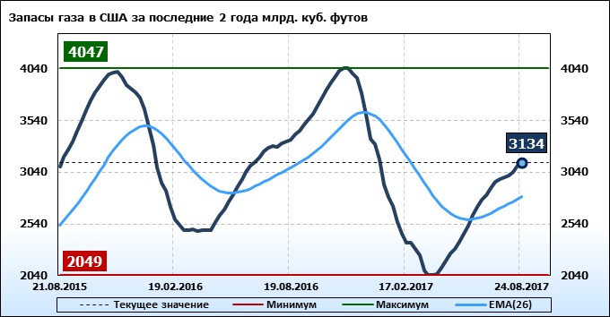 По сообщению статистической службы EIA запасы газа в США на 24.08.2017 составили 3091 млрд. куб. футов. За неделю запасы природного газа в хранилищах выросли на 43 млрд. куб. футов. По итогам недели рост запасов газа составил 1.39 процента.