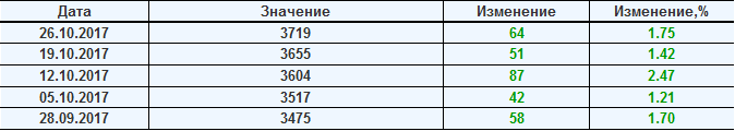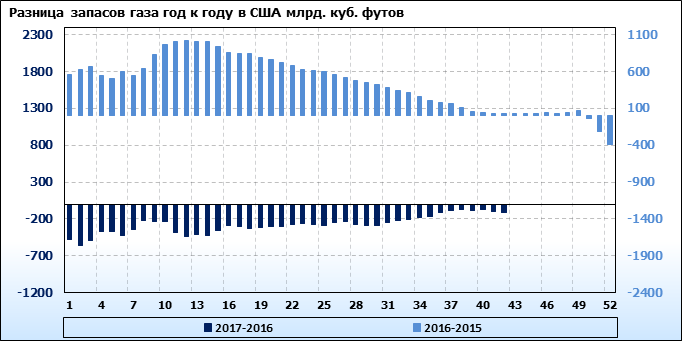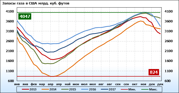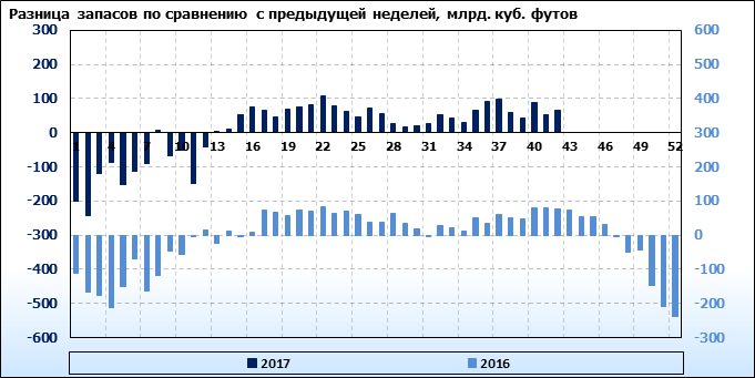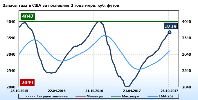 По сообщению статистической службы EIA запасы газа в США на 26.10.2017 составили 3719 млрд. куб. футов. За неделю запасы природного газа в хранилищах выросли на 64 млрд. куб. футов. По итогам недели рост запасов газа составил 1.75 процента.