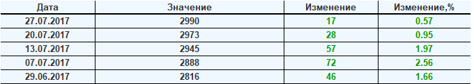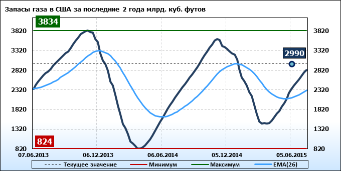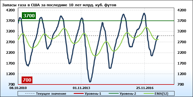 По сообщению статистической службы EIA запасы газа в США на 27.07.2017 составили 2990 млрд. куб. футов. За неделю запасы природного газа в хранилищах выросли на 17 млрд. куб. футов. По итогам недели рост запасов газа составил 0.57 процента.