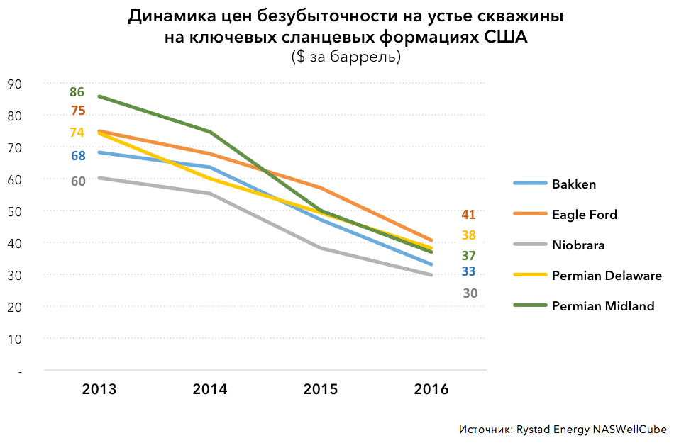 Добыча сланцевой нефти с годами становится прибыльнее. С 2013 года цена безубыточности на устье скважины (wellhead breakeven price) для ряда ключевых сланцевых формаций сократилась в среднем на 50%, с $72 до $36 за баррель. Среди ключевых сланцевых формаций США Permian Midland занимает лидирующую позицию по темпам падения цены безубыточности (только для горизонтальных скважин) — с $86 за баррель в 2013 году до $37 за баррель в 2016 году, или почти на 60%.