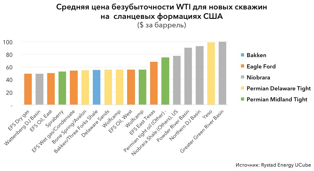 Среди ключевых причин циклического падения цен безубыточности на устье скважин — концентрация операторов сланцевых активов на разработке и разбуривании наиболее продуктивных пластовых зон (так называемые sweet spots) и более низкие удельные производственные и нефтесервисные издержки.