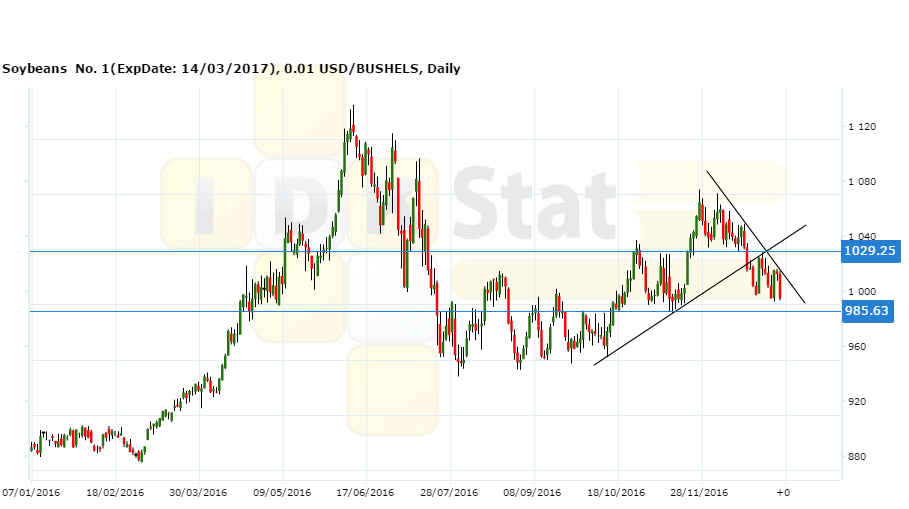 Сценарий падения:продолжаем держать продажи от 1050.00.Снова двигаем стоп, теперь на уровень 1021.00. Рынок масличных отличается от рынка зерновых, поэтому мы можем рассчитывать на своенравное медвежье поведение, на фоне бычьих тенденций на ранках других сельхозкультур.