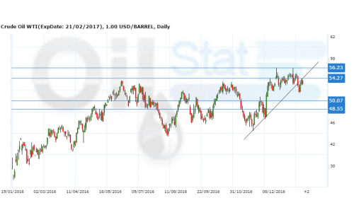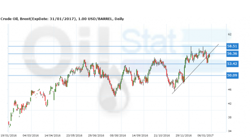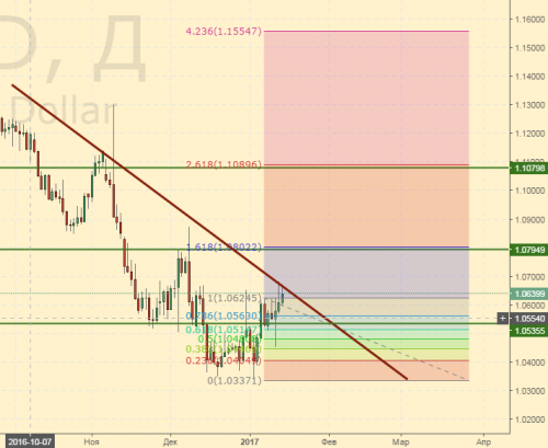 Сценарий роста: цены прошли вниз линию поддержки и сейчас тестируют её с обратной стороны. Место для покупок очень провокационное, очень слабое, так как цены и без того высоко, так еще и медведи прямо с понедельника будут защищать район 56.50 весьма неистово. Быкам нужна фундаментальная, политическая помощь. До выступления Трампа 20-го января её не будет. Если исходить из техники, то район 49.00 – 50.00 наиболее интересен для покупок.