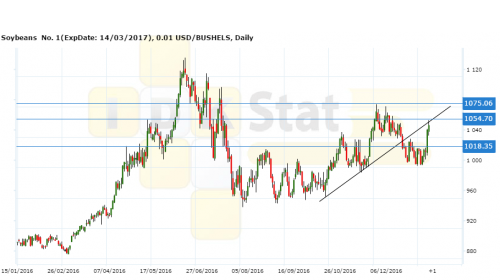 Сценарий роста: бычки пытаются вернуть себе рынок. Движение пока застопорилось в районе 1050.00. Однако, учитывая весеннюю панику потенциального голода и дефицита. Вряд ли все закончится на 1050.00. При спуске к 1020.0 покупаем обязательно. Если рынок такой возможности не даст, то ищем возможности на часовых графиках выше 1050.00. Структура может раскрутиться до 1400.00.