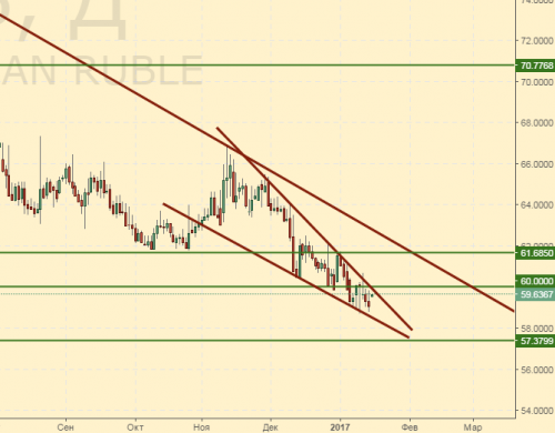 Сценарий роста: видим снижение волатильности в рамках падающего канала, отсутствие четких импульсов и коррекционных движений. «Все смешалось в доме «Обломовских», — почти повторяя классика. 57.00 смотрится бетонно. Бывали случаи, когда цена из «диагонально треугольника» – являющегося «черной меткой» любого движения хоть то вверх, хоть то вниз проливалась вниз или улетала вверх, следуя за направлением, которое указывал клин, но их по пальцам пересчитать. Покупать будем или выше 60.00 или от 57.00. Ждем. Пусть рынок сам примет решение. Без нас. У нас денег мало.