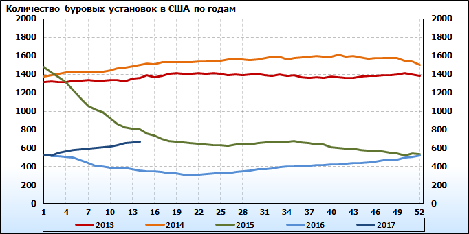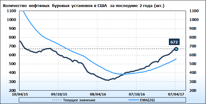 Baker Hughes. Количество нефтяных буровых установок в США на 7.04.2017