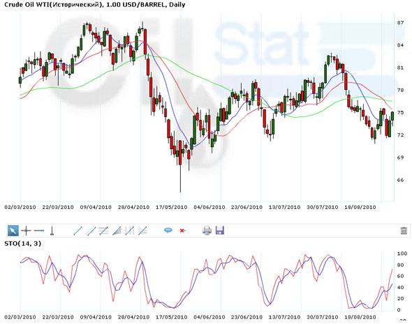 В четверг октябрьский контракт на нефть в Нью-Йорке закрылся подъемом цен, закрытие в верхней части дневного торгового диапазона предполагает сильное открытие в пятницу. Стохастический индикатор и RSI направлены вверх, указывая на то, что подъем возможен в ближайшее время. Закрытия выше двадцатидневной скользящей средней 75,58 за баррель требуются для подтверждения того, что локальные минимумы уже достигнуты. Если октябрь возобновит падение, следующей целью «медведей» станет низшее значение мая – 70,35 за баррель. Ближайшее сопротивление — максимум прошлой пятницы – 75,21 за баррель. Следующее сопротивление – 75,85 за баррель. Ближайшая поддержка – 70,76 за баррель. Следующая поддержка – 70,35 за баррель.