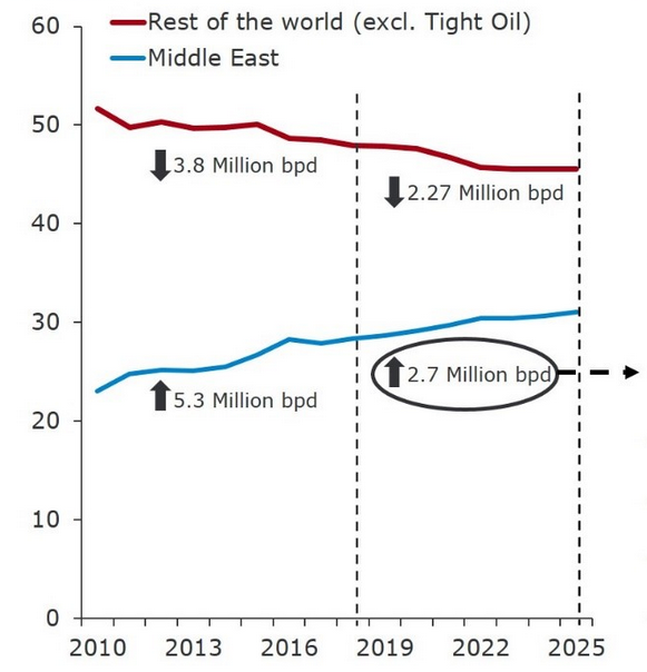 По подсчетам аналитиков Rystad Energy, объемы нефтедобычи в странах Ближнего Востока к 2025 году возрастут на 2.7 млн. баррелей в день. Больше всех производительность сможет нарастить Ирак — 1.5 млн. баррелей в день.