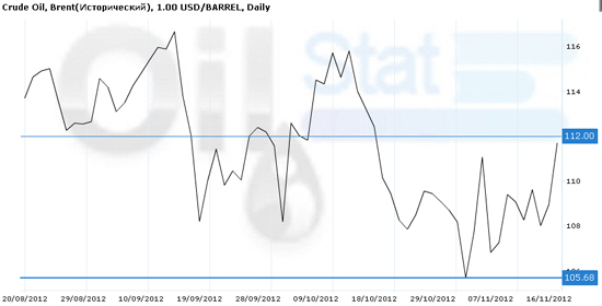 Напряженность на Ближнем Востоке тащит нефть вверх. Кроме того, как стало известно, экспорт нефти из РФ за 10 месяцев 2012г. снизился по сравнению с аналогичным периодом 2011г. на 0,3% и составил 200,196 млн т, говорится в материалах Минэнерго РФ. Это создает повышательные риски для нефти. Однако инвесторов не менее интересуют негативные экономические прогнозы и тенденция бегства от рисков. Инвесторы с надеждой ждут заседание министров финансов 17 стран еврозоны по вопросу bailout Греции, которое состоится в Брюсселе сегодня вечером. Министры склонны все-таки одобрить очередной транш помощи Греции.