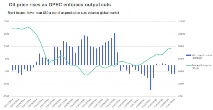 Рис. 1 Цена на нефть возросла по мере введения ОПЕК ограничений по нефтедобыче