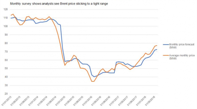 Опрос, проведенный Reuters, показывает, что цены на нефть в текущем и следующем годах будут стабильными. Увеличение объемов нефтедобычи в странах ОПЕК и США будет компенсировано ростом спроса в Азии, а также сокращением поставок в Иране и иного рода обстоятельствами. По прогнозам 44 опрошенных экономистов и аналитиков, цена на Brent LCOc1 в 2018 году составит $72.87 за баррель, что на 29 центов больше, чем указывалось в предшествующем прогнозе. Данный показатель в первой половине текущего года составил $71.68 за баррель.