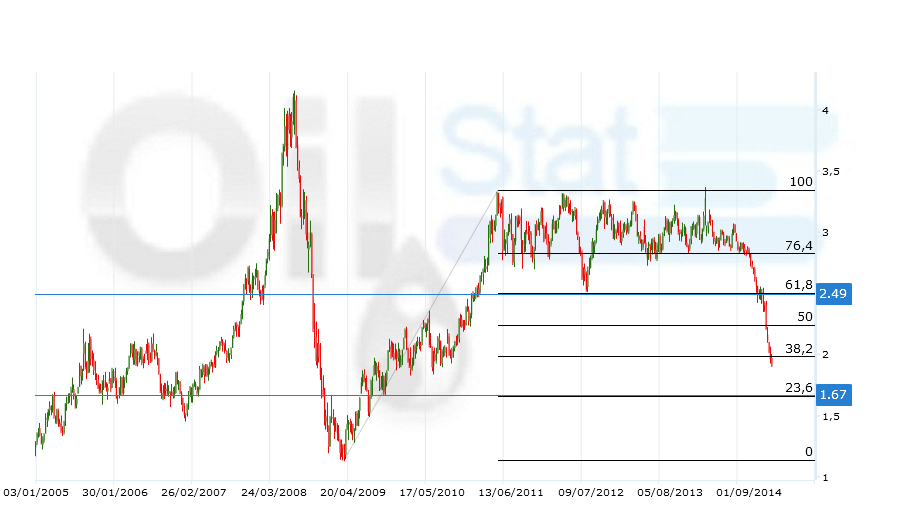 Поддержка–1.67.Сопротивление – 2.49.Сценарий роста: как мы отмечали ранее, более глубокое движение к 1.68 на фоне календарной зимы будет выглядеть вызывающе и неестественно, и тем не менее рынок не удержался на 2.00. Не исключен вариант, что рынок энергоносителей задержится на глубоких уровнях на полгода и более, однако такая ситуация не пойдет на пользу нефтяной отрасли.