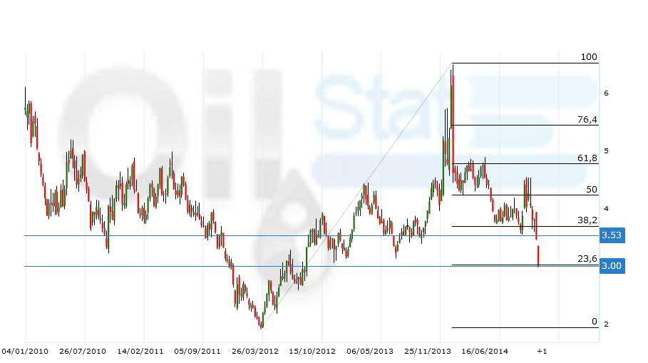 Сценарий роста:крайне удручающая ситуация для быков. Рынок продолжает падать, и поддержка на 3.00 не выглядит основательной, хотя технически она безусловно значима и покупка с коротким стопом под минимумом прошлой недели неплохой шаг.Более глубокие покупки можно делать от 2.22 (см. историю за последние 10 лет).