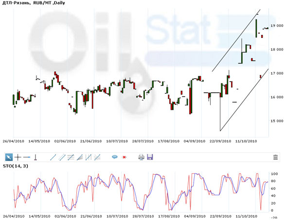 Сегодня индекс «eOil»-ДТЛ продолжил рост и достиг отметки 18908 руб. за тонну на базисе «Рязань». Как мы видим, ралли вверх началось в конце сентября, когда цена экспортной альтернативы заметно выросла. В течение октября цены на топливо поднимались под воздействием сильного спроса, а также высокой цены на нефть. Стохастический индикатор продолжает находиться около отметки 80% и постепенно ползет вверх, потенциал для роста еще имеется. По мнению трейдеров, цены на ДТЛ должны снизиться только в ноябре. Основным фактором, оказывающим давление на стоимость этого вида топлива, остаются погодные условия. Пока, уличная температура позволяют использовать ДТЛ.