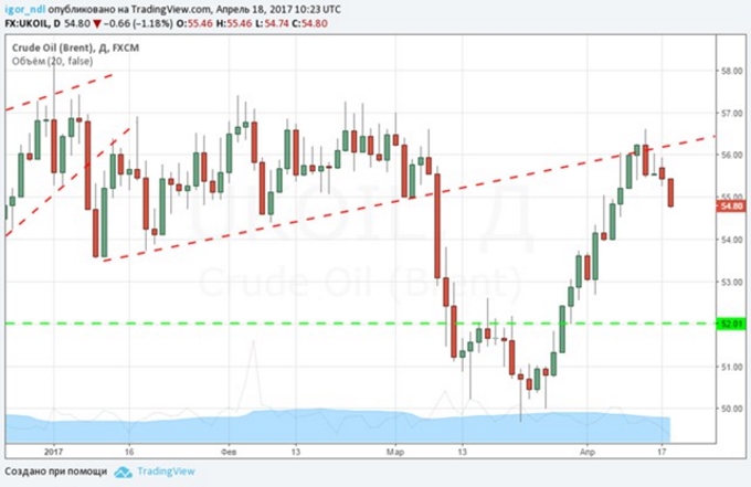 Цены на нефть снова перешли к снижению. Падение котировок продолжается уже четвертый день подряд. Что это, начало нового нисходящего тренда или коррекция? Фьючерсные контракты на нефть марки Brent сегодня падают ускоренными темпами. По состоянию на 13:20 по московскому времени падение составляет более 1%, торги идут в районе отметки $54,81.