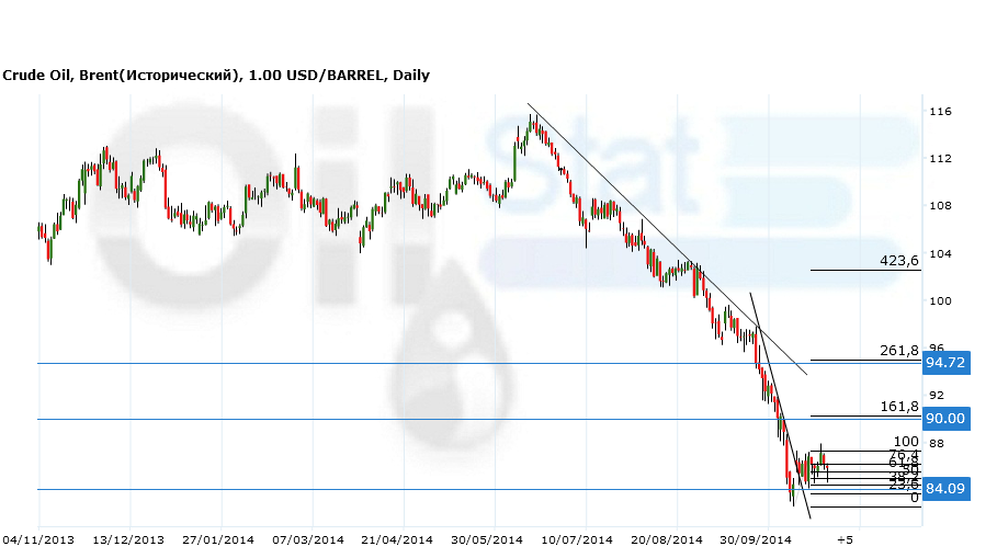Сценарий падения:быки за три недели выжали из себя всего одну длинную зеленую свечу и медведям пока нечего опасаться. Надо встречать рынок в районе 88.00 пытаясь отправить цены к к72.60. Возможные отскоки вверх и особенно уровень 90.00 можно использовать для продаж.