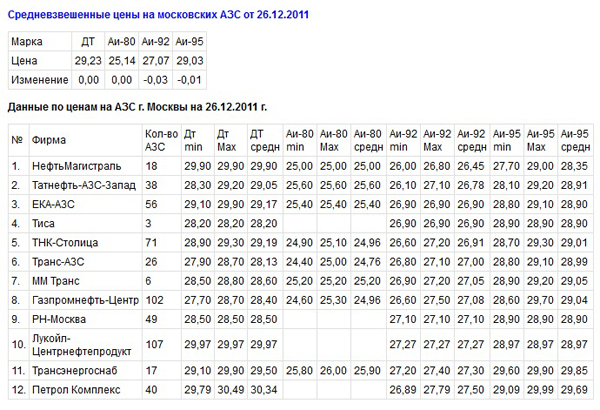 Средневзвешенные цены на московских АЗС с 19 по 26 декабря 2011 года снизились и составили, по данным Московской топливной ассоциации: дизельное топливо — 29,23 рублей, Аи-80 — 25,14 рублей, Аи-92 – 27,07 рублей, Аи-95 – 29,04 рублей, пишет Аи92.