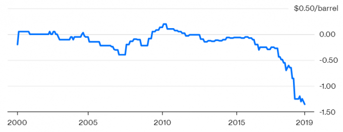 Рис. 2 Дисконт иранской нефти в отношении нефти марки Arab Medium достиг рекордных значений