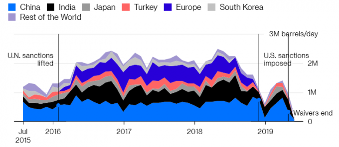 В прошлом году США, возобновив санкции против Ирана, предоставили ряду импортеров отстрочку. Благодаря этому потоки нефти не прекратились полностью.