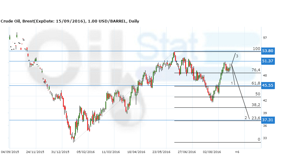 Сценарий роста:мы предполагали резкий откат с текущих уровней в том случае если неведомый кто-то безосновательно расшатывает рынок. Однако, видим, что цены стабилизировались. В целом рынок идентичен Brent, поэтому не ждем хода выше 51.79, откуда крайне вероятно должен будет последовать откат. Рабочим остается сценарий продолжения отката к 43.70 с текущих уровней.