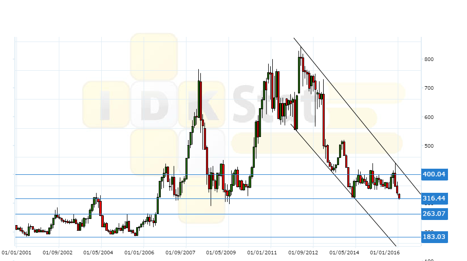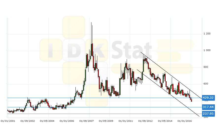 Сценарий роста: наблюдаем обвал. За неимением идей на рабочем дневном интервале, откроем историю за 15 лет. Как видим, цены показывают чудеса. Толстосумам могу предложить чудесную стратегию, результат от которой вы получите максимум через год, а то и ранее. При продолжающемся падении цен покупаем с шагом в 50 долларов. Ноль же пшеница не будет стоить. Только посчитайте все аккуратно. Рынок цикличен, урожаи неустойчивы, уже через 4 месяца всех будет волновать судьба будущего урожая.