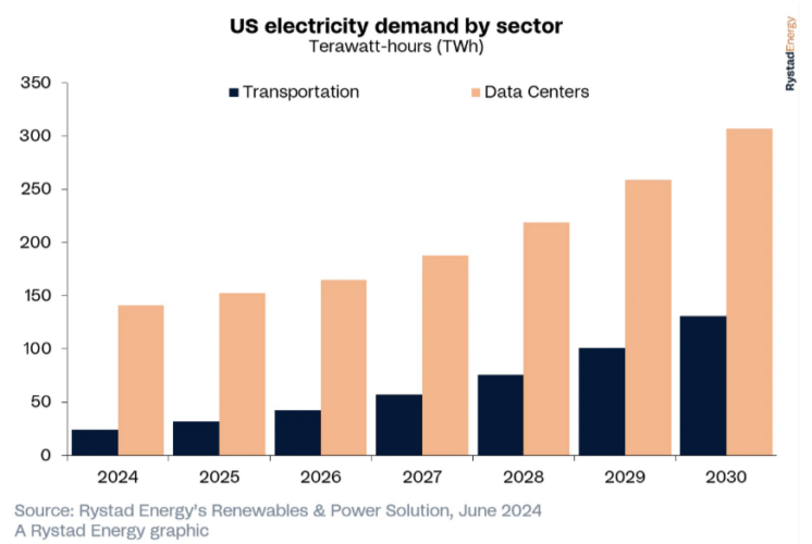 Строительство центров обработки данных (ЦОД) и более широкое внедрение электромобилей, как ожидается, приведут к росту спроса на электроэнергию в США в ближайшие годы. Согласно исследованию Rystad Energy, только эти два сектора увеличат потребление электроэнергии на 290 тераватт-час (ТВтч) к 2030 году.
