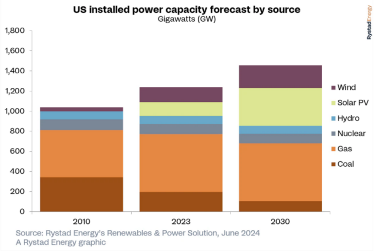 Рис 2. Прогноз установленной мощности в США по источникам Источник: Rystad Energy