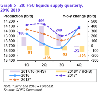 В 2017 году прогнозировался рост добычи нефти в России и Казахстане и снижение в Азербайджане и других странах бывшего СССР. Ожидается, что в 2018 году, после пересмотра в сторону повышения на 25 тб/день в прогнозе добычи нефти в России, объем производства стран бывшего СССР будет снижаться на 0,13 мб/день. В основном это будет происходить за счет России, до 13.93 мб/день.