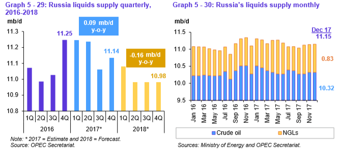 При условии, что уровень производства составит 10,98 мб/день в соответствии с Декларацией о сотрудничестве между ОПЕК и другими странами, не входящими в ОПЕК, ожидается, что добыча жидкостей в России снизится на 0,16 мб/день до 11,00 мб/день.