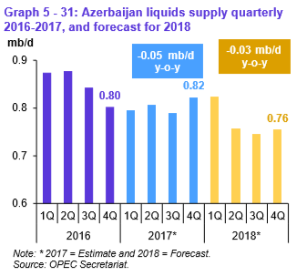Предложения по жидкостям в Азербайджане достигли объема в 0.80 мб/день. По прогнозам, уровень производства должен был достичь, в среднем, 0.73 мб нефти/день и 0.07 газоконденсатных жидкостей в день в 2017 году.