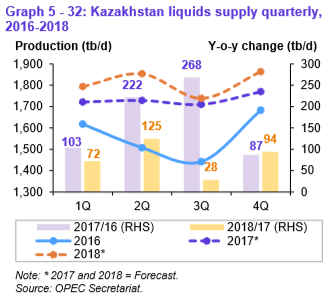 Производство жидкостей в Казахстане в январе упало на 0.01 мб/день, по сравнению с декабрем. Итого, средний объем производства составил 1.80 мб/день. Предварительные объемы предложения в первом квартале 2018 года выросли на 0.02 мб/день и достигли 1.79 мб/день.
